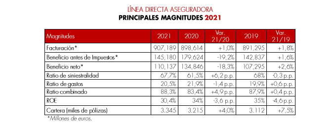 Patricia Ayuela, consejera delegada de Línea Directa Aseguradora, valora que "la compañía ha obtenido en 2021, primer año como sociedad cotizada en Bolsa, unos resultados excelentes: lo más altos de su historia en cuanto a ingresos y unos beneficios excelentes, un 2,6% más que en 2019, lo que es realmente meritorio teniendo en cuenta la adversa coyuntura del mercado. En un ejercicio marcado por tensiones en la cadena de suministros que afectan a las ventas de vehículos y por una elevada competencia, Línea Directa Aseguradora ha superado los 900 millones de facturación creciendo en clientes en todas las líneas de negocio, y de forma muy destacada en Hogar y Salud, fruto de un excelente desempeño comercial". Añade que, por otro lado, "la solidez técnica del grupo nos ha permitido mantener uno de los mejores ratios combinados del sector asegurador español, lo que es una fortaleza y ventaja competitiva en situaciones de incremento de la siniestralidad e inflacionarias como la actual. La solidez y recurrencia de estos resultados, la cómoda posición de solvencia del grupo y el rápido avance que estamos haciendo en nuestras iniciativas estratégicas nos permiten ser optimistas, seguir generando valor y mantener nuestro compromiso de retribución al accionista".