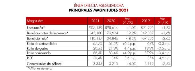 Línea Directa cerró el pasado ejercicio con ingresos por primas de 907,1 millones de euros, un 1% más que en el mismo periodo del ejercicio anterior, logrando por primera vez superar la facturación de 900 millones facturados. Atribuye el crecimiento tanto al incremento del número de asegurados en todas las líneas de negocio, especialmente en Hogar y Salud, como a la "capacidad para fidelizar la cartera". Las ventas netas aumentaron un 1,3%, hasta las 574.000 pólizas, y la cartera superó los 130.000 asegurados (+26,6%).