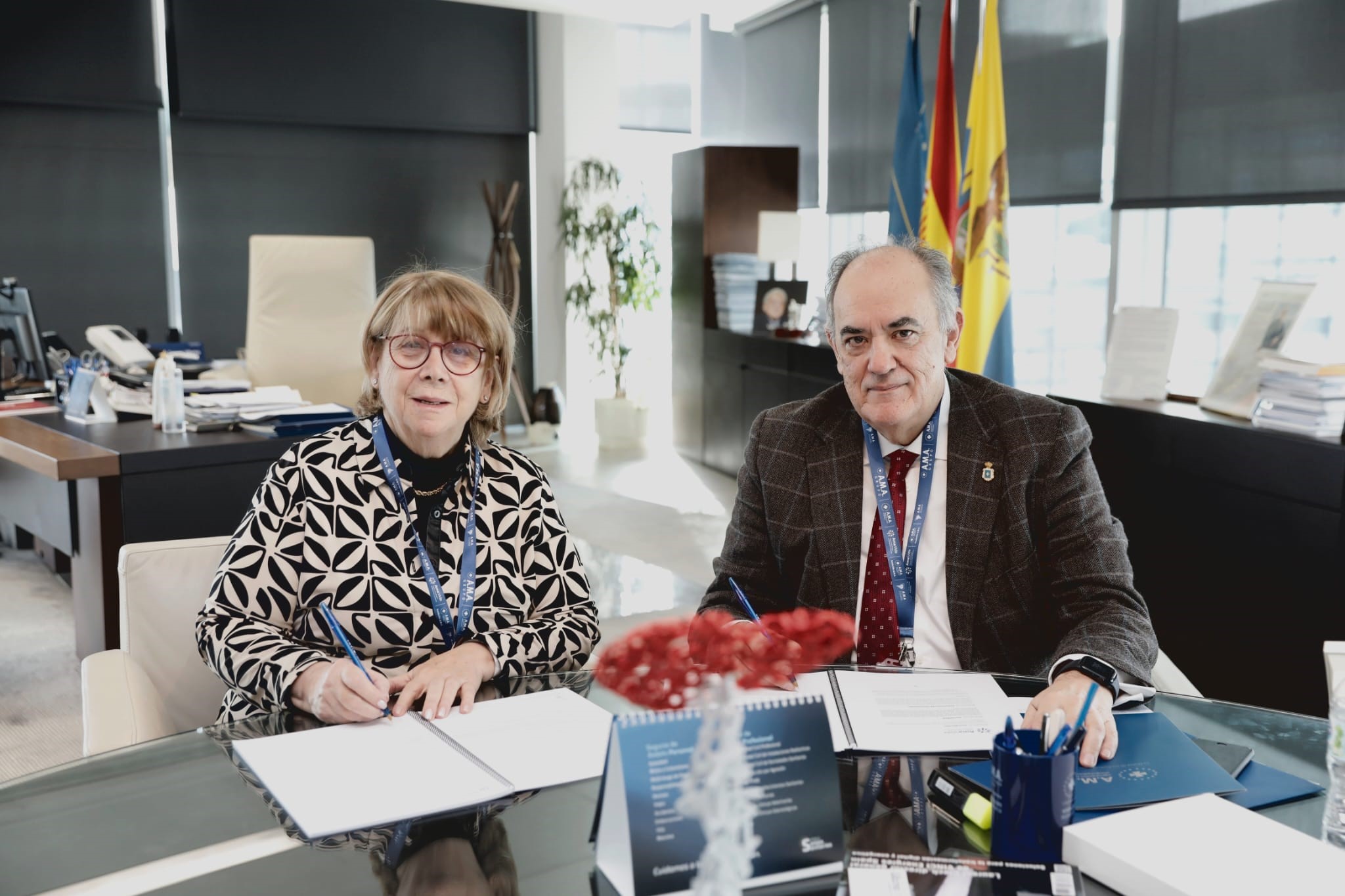 A.M.A. Grupo y el Colegio de Médicos de Ávila han firmado la nueva póliza colectiva de Vida que proporciona cobertura a todos los colegiados de la institución. En la firma estuvieron presentes el presidente de la mutua, Luis Campos, y la presidenta del Colegio, María Begoña Sahagún.
