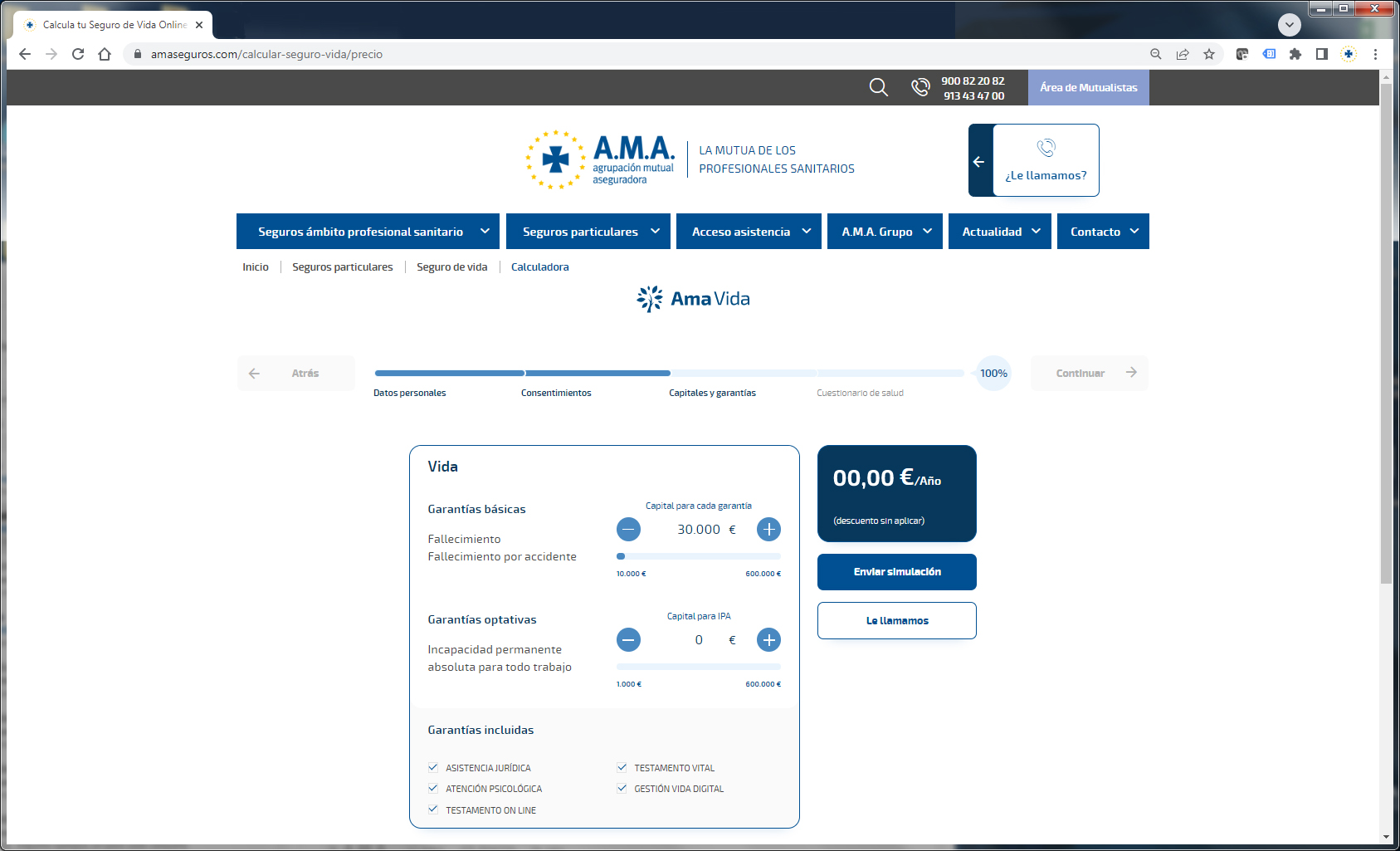 A.M.A. ha puesto a disposición de los profesionales sanitarios y sus familiares un nuevo tarificador online para calcular y contratar fácilmente el seguro de Vida en menos de 2 minutos. Explica sobre su funcionamiento que el usuario solo debe rellenar los datos personales, aceptar los consentimientos, seleccionar capitales y garantías y contestar un breve cuestionario de salud. Con esos datos se crea inmediatamente una simulación. Para finalizar la contratación, un asesor de A.M.A. se pondrá en contacto con el mutualista para personalizar y completar la oferta y ampliar toda la información que necesite.