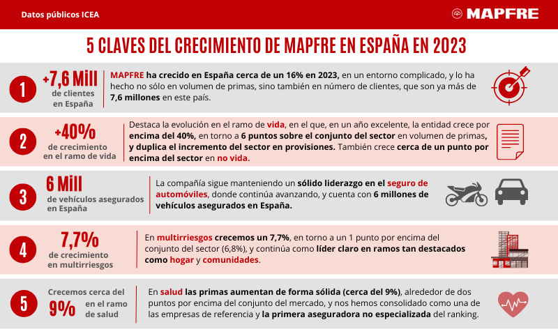 Ahora, ha adelantado más cifras correspondientes al negocio en España, destacando el buen comportamiento en el segmento de Vida, donde ha crecido más de un 40%. Y, también, pone de relieve la evolución en Multirriesgos (+7,7%) y en Salud (+9%). Asimismo, informa la aseguradora que en 2023 ha acabado con más de 7,6 millones de clientes en España.