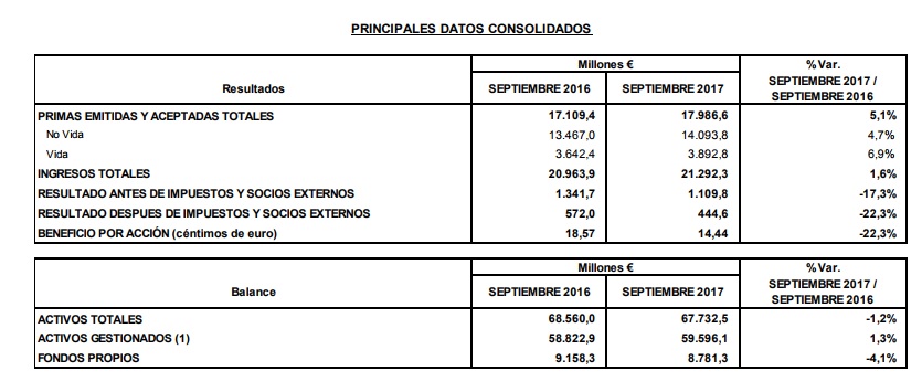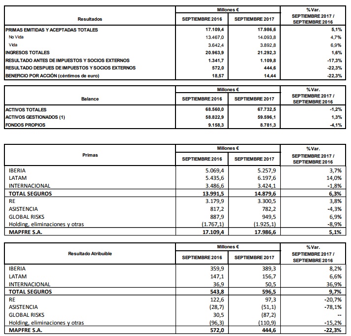 Los ingresos de Mapfre durante los 9 primeros meses del ejercicio ascendieron a 21.292 millones de euros, lo que supone un incremento del 1,6% respecto al mismo período del año anterior. Las primas crecieron un 5,1%, hasta los 17.987 millones, impulsadas por el aumento del negocio en España, México y los negocios reaseguradores y de riesgos globales. El beneficio neto, por su parte, se situó en 445 millones de euros, con un descenso del 22,3%, debido a los costes de las recientes catástrofes naturales que se han registrado tanto en Norteamérica como en el Caribe, cuyo impacto estimado es de 176 millones de euros netos. Si se excluyese el efecto de estas catástrofes, el beneficio atribuido hubiera crecido un 8,6%.