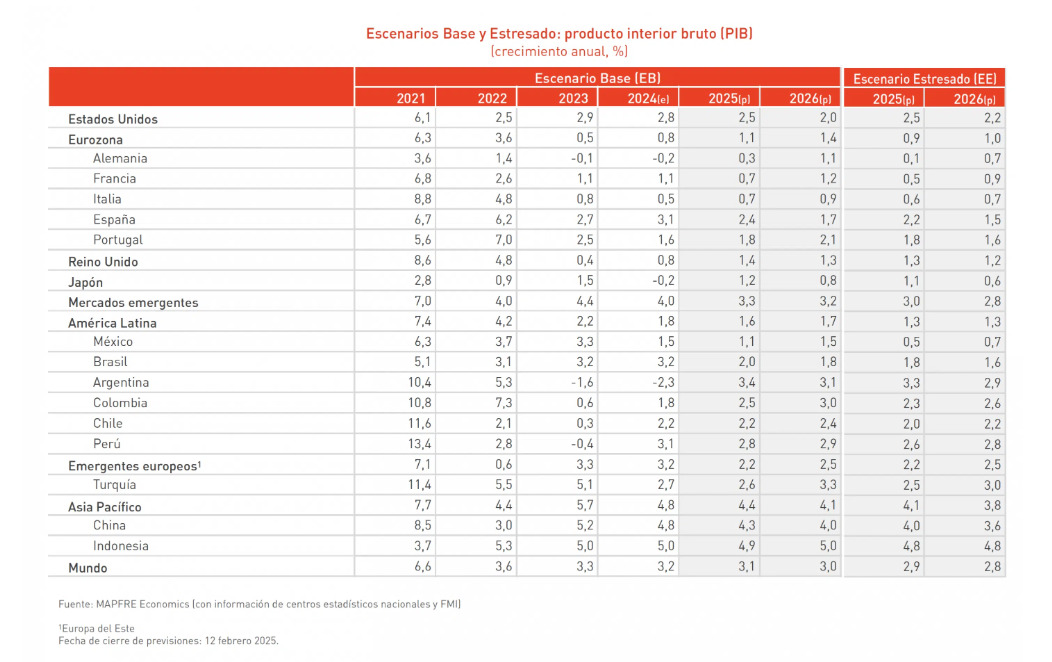 Para la eurozona, Mapfre Economics prevé un desempeño en general "débil" determinado por "los los obstáculos todavía sin resolver y por el incierto desafío comercial". En líneas generales, el grupo asegurador esepra un aumento del PIB del 1,1% este año y del 1,4% el siguiente; la inflación quedará en el 2,3% al cierre del 2025 y bajará al 1,7% en 2026.