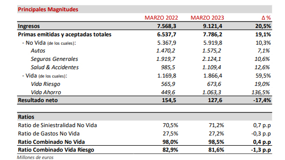 El grupo registró un volumen de primas de 7.786 millones, un 19% más y sus ingresos totales se elevaron hasta los 9.121 millones, con un crecimiento del 21% en relación al primer trimestre del pasado año.