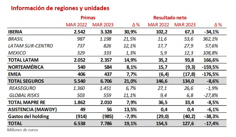 El negocio de Latam, que ya se formula con la nueva terminología, ha sido el que más ha contribuido a los resultados del grupo con casi 94 millones, un 166% más. Las primas totales en esta región alcanzaron los 2.357 millones (+15%). Por su parte, el negocio en Estados Unidos mejoró un 8,1% en primas hasta los 584 millones; la región EMEA también avanza en primas hasta los 437 millones, un 7,7% mejor que hace un año.