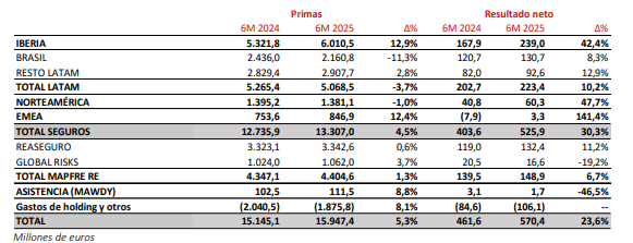 Brasil ha obtenido un beneficio neto de 131 millones (+8,3%) y un volumen de primas de 2.161 millones, reduciéndose un 11,3% por el fuerte impacto de la depreciación del real brasileño (-11,6%). En el resto de Latam, el resultado neto ha sido de 92,6 millones de euros en el primer semestre (+12,9%) mientras que las primas se han incrementado un 2,8% ascendiendo a 2.907,7 millones. Por países, en México, las primas han ascendido a 1.120 millones de euros (+5,5%) tras la depreciación del peso (-15,2%); y en Perú, a 427 millones (+11%); en Colombia, a 281 millones (+3,1%). En el resto de Latam el ratio combinado ha mejorado casi 4 puntos hasta el 95,1%. Por tanto, el conjunto de Latam acaba el primer semestre incrementando un 10,2% el beneficio neto, hasta los 223,4 millones, pero se reduce un 3,7% la recaudación, quedándose en 5.068,5 millones de euros..png)
