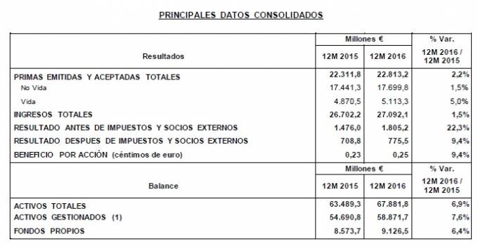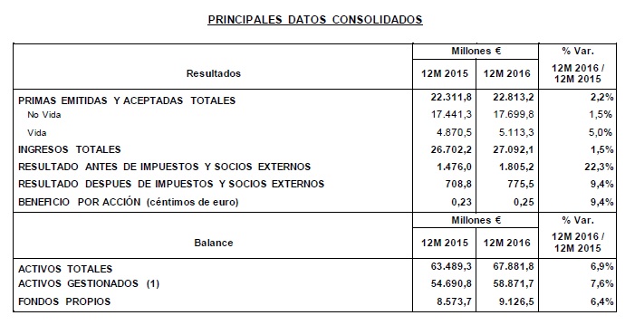 Mapfre ha obtenido un resultado neto en 2016 de 775,5 millones, lo que supone un crecimiento del 9,4% respecto al año anterior. La entidad destaca que el año ha estado marcado por el buen comportamiento de sus 3 principales mercados (España, Brasil y EEUU) y los buenos resultados de Mapfre Re. El beneficio neto de Mapfre, si se descuentan los extraordinarios en ambos ejercicios, crecería un 41%. Los ingresos del grupo se situaron en 27.092 millones de euros, cifra que representa un incremento del 1,5% respecto al año anterior, y las primas registraron un aumento del 2,2%, hasta los 22.813 millones de euros.