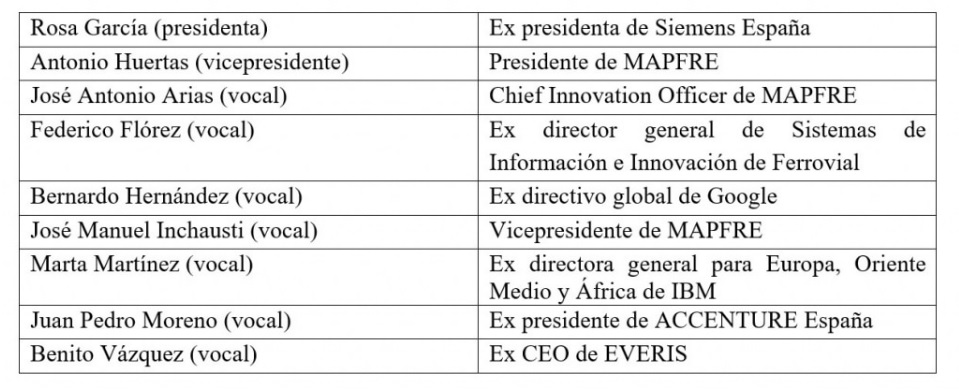 El Consejo Asesor de Tecnología, Innovación y Transformación está presidido por Rosa García y del mismo también forman parte tres ejecutivos de la compañía: Antonio Huertas, presidente de la aseguradora, José Manuel Inchausti, vicepresidente de la compañía y CEO de Mapfre Iberia, y José Antonio Arias, director del Área corporativa de transformación de la operación y máximo responsable de Mapfre Open Innovation, la plataforma de innovación abierta de la compañía.