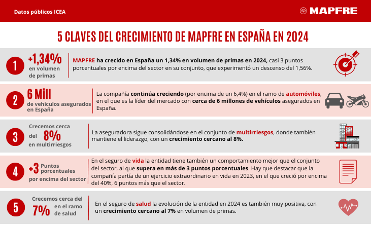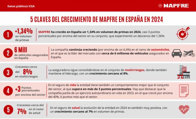 A raíz de la publicación por parte de ICEA de los resultados del sector asegurador en 2024, Mapfre ha facilitado algunas de las magnitudes obtenidas en España al cierre del pasado ejercicio. Así, la aseguradora revela que incrementó su volumen de primas un 1,34% en el mercado español, creciendo por encima del 6,4% en Autos, cerca de un 8% en Multirriesgos y alrededor de un 7% en Salud.