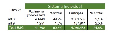 En concreto, "los Planes de Pensiones que promueven características medioambientales y sociales (art.8) acumulaban 40.449 millones de euros (49,2% del total de Planes del Sistema Individual), y 1.251 millones de euros (1,5% del total) los Fondos con objetivo de inversión sostenible (art.9)".