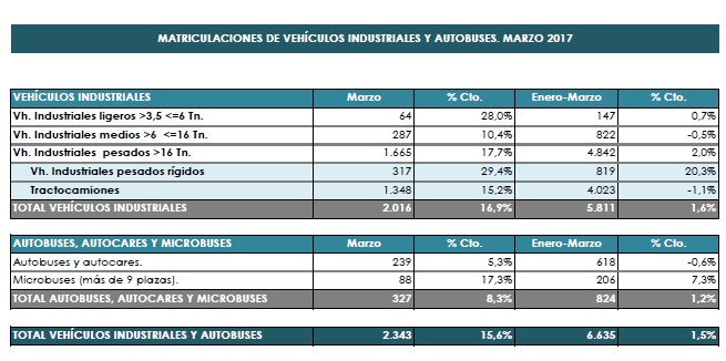 La matriculación de vehículos industriales y autobuses crece un 1,5% en el primer trimestre aunque, según Anfac, los registros están todavía muy lejos de los volúmenes logrados antes de la crisis. En los tres primeros meses de 2017 se han alcanzado ya las 6.635 unidades.