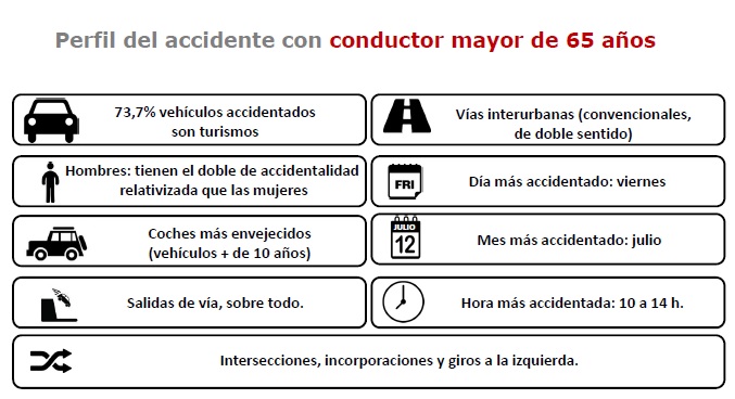 Línea Directa también ha profundizado en los tipos de accidentes en los que se ven implicados. El perfil de accidente con mayores de 65 años se produce normalmente en vías interurbanas convencionales, se ven implicados hombres que utilizan turismo de más de 10 años y el accidente se suele producir de día por salidas de la vía o por incorporaciones incorrectas.
