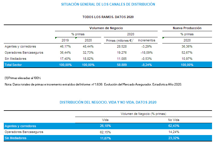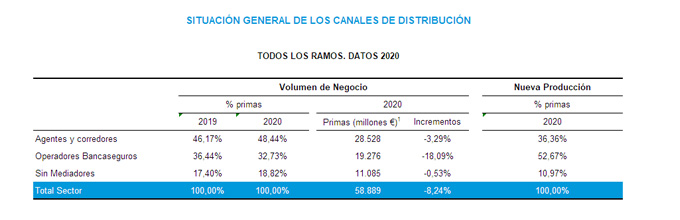 Según los datos, agentes y corredores comercializaron el pasado año el 62% de las primas de No Vida (62,95% en 2019) y el 26% de las de Vida (25,16%); por su parte, los OBS lo hicieron prácticamente al revés, suscribieron el 62% de Vida (64,84%) y el 14% de No Vida (14,01%). El canal no mediado firmó el 23% de No Vida (23,04%)y cerca del 12% de Vida (10%).