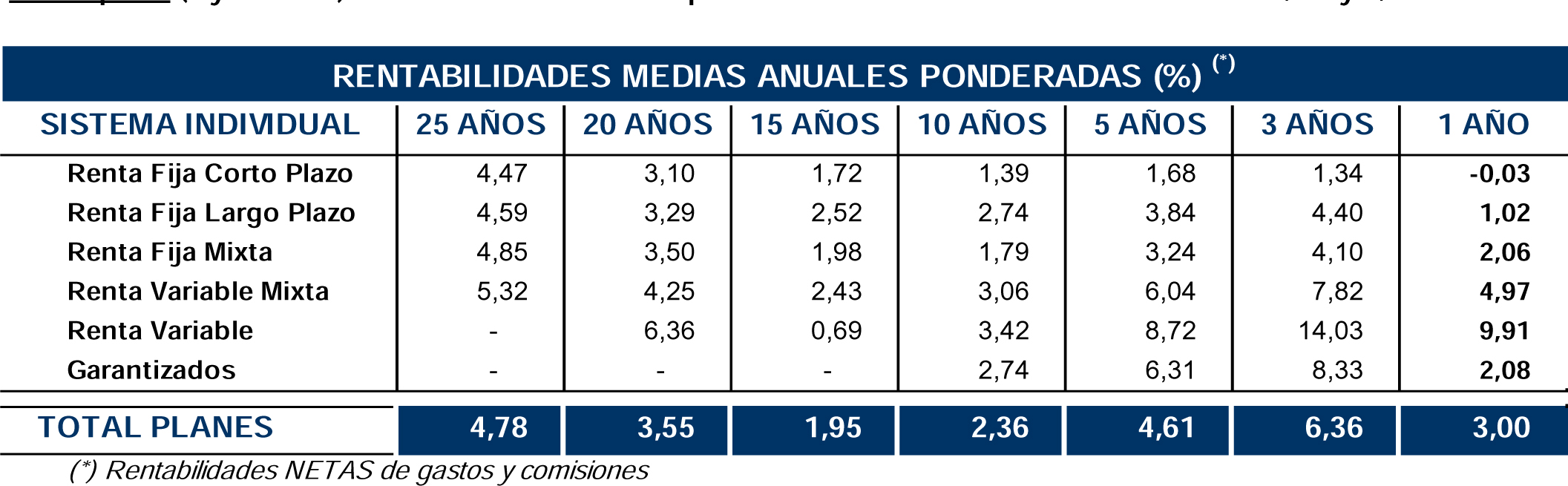 En el largo plazo (25 años), la rentabilidad media anual alcanza el 4,8% para el total de Planes; y en el medio plazo (5 y 10 años) los Planes de Pensiones presentan una rentabilidad media anual del 4,6% y 2,4% anual, respectivamente.