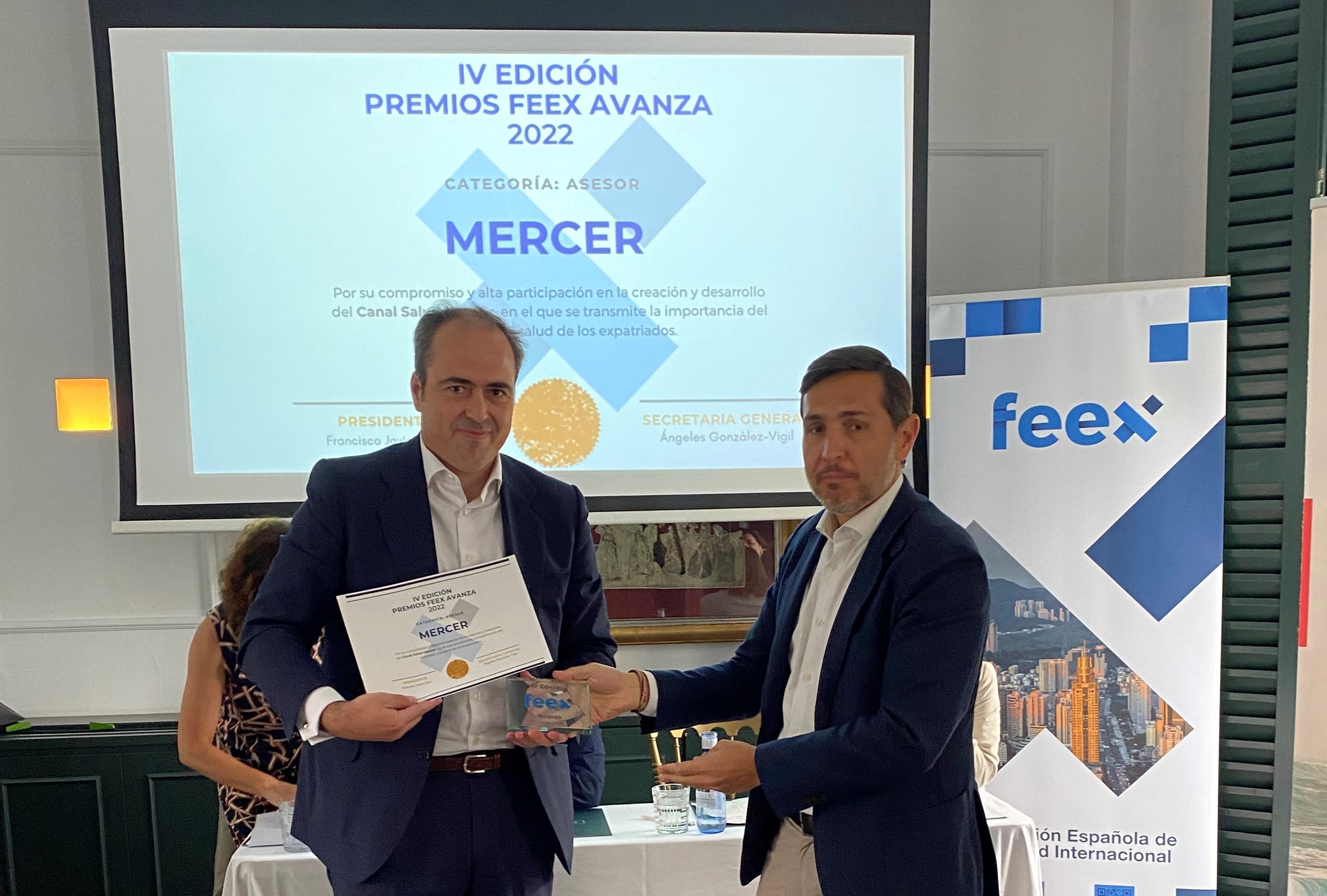 Mercer España ha sido reconocida con el premio FEEX Avanza, unos galardones concedidos anualmente por la Asociación Española de Movilidad Laboral Internacional a sus socios y colaboradores como reconocimiento a su dedicación a los distintos proyectos que realiza la Comunidad FEEX para impulsar la internacionalización de las empresas y el desplazamiento de sus profesionales.