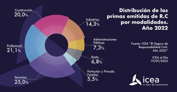 Y, en tercer lugar, se halla Construcción, con el 20% de las primas y el 10,9% de las pólizas. Todos estos datos los ha facilitado ICEA de su estudio 'El seguro de Responsabilidad Civil. Año 2022".