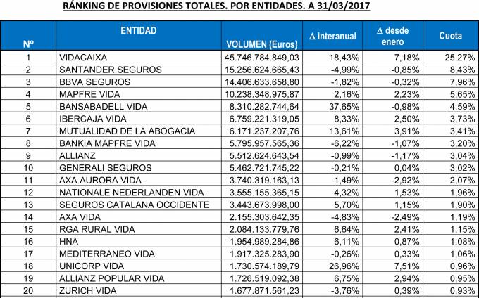 El ranking de las principales entidades aseguradoras del ramo de Vida por volumen de provisiones lo sigue dominando de lejos VidaCaixa, con una cuota de mercado del 25,27% y un ahorro gestionado de clientes que superaba a finales de marzo los 45.746 millones de euros, según los datos de ICEA. El quinteto ganador lo completan Santander Seguros (8,43%, 15.256 millones), BBVA Seguros (7,96%, 14.406 millones), Mapfre Vida (5,65%, 10.238 millones) y Bancsabadell Vida (4,59%, 8.310 millones de euros), entidad que se cuela en esta clasificación tras desplazar a Ibercaja Vida y después de haber incrementado el volumen de provisiones en un año un 37,65%, el mayor avance de todo el sector.