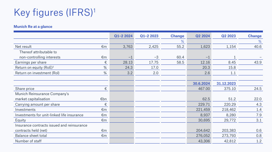 Munich Re ha comunicado que en el primer semestre ha logrado un resultado de 3.763 millones de euros, un 55,2% superior al mismo periodo de 2023. En el segundo trimestre su resultado se elevó hasta los 1.623 millones y la aseguradora mantiene su objetivo para llegar a los 5.000 millones al cierre del año.