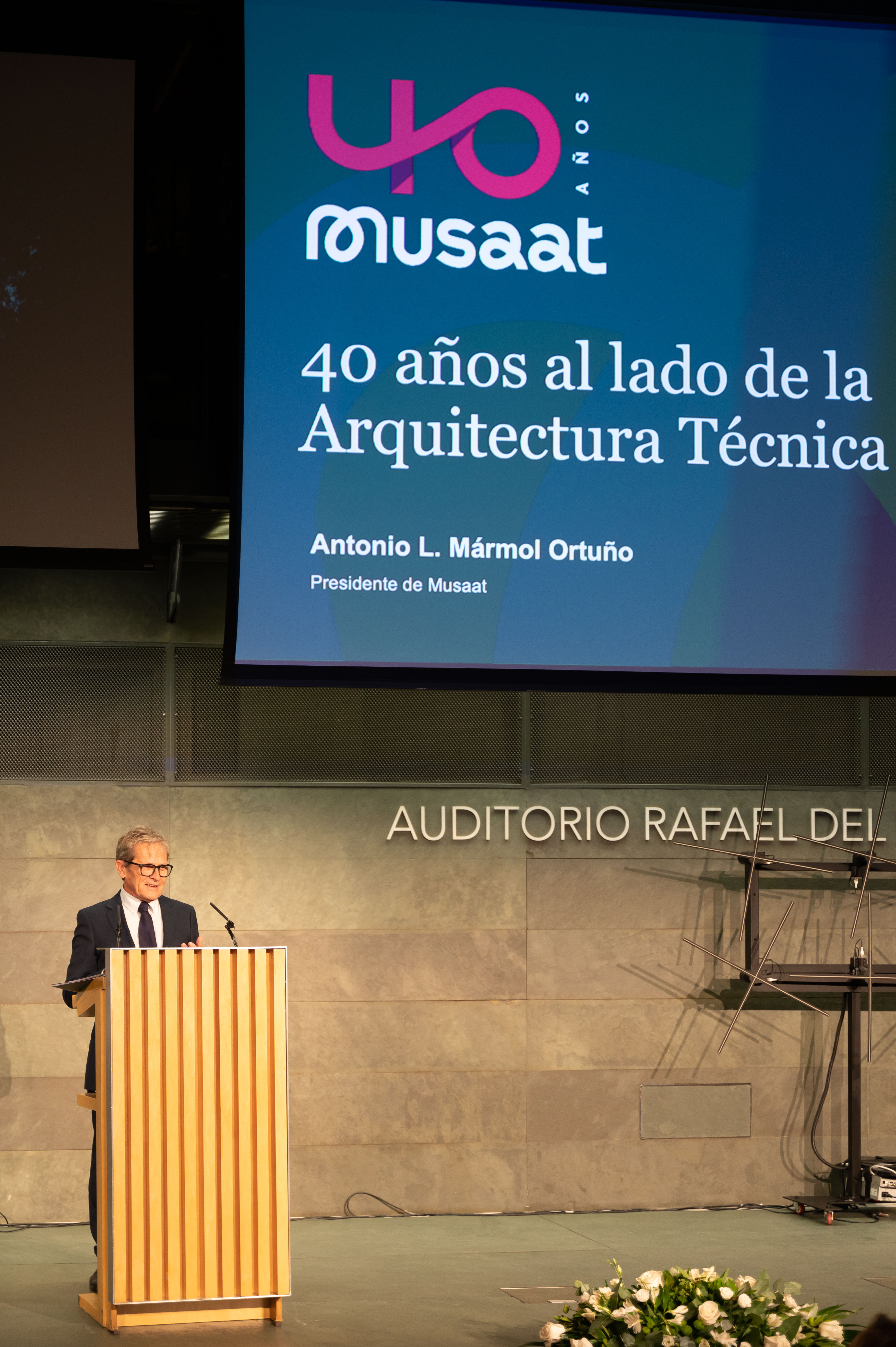 Antonio L. Mármol, presidente de la entidad, agradeció a los "valientes, atrevidos e intrépidos" que en 1983 decidieron crear, con el apoyo del Consejo General de la Arquitectura Técnica (CGATE), de Premaat y de 39 Colegios Profesionales, la Mutua de la Arquitectura Técnica con el objetivo de proteger con todas las garantías a estos profesionales frente a las reclamaciones de responsabilidad civil. Destacó también la colaboración activa de Musaat con los Colegios Profesionales de la Arquitectura Técnica y su contribución en proyectos de formación y promoción del colectivo.