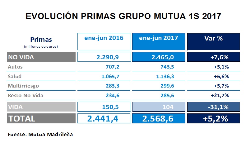 En No Vida, su principal negocio, consiguió 2.465 millones, un 7,6% más que junio de 2015, con importante avance del negocio de Autos. En este ramo mejoró un 5,1% las primas hasta los 743 millones y cuenta con una cuota de mercado del 13,2%. Mutua resalta que este avance se debe a la llegada de nuevos asegurados y no por la subida de primas puesto que un año más la compañía congeló las tarifas a 1,3 millones de mutualistas.