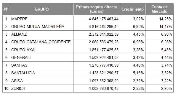 Mutua Madrileña (+6,90%), santalucía (+5,15%), Sanitas (+4,48%) y Allianz (+4,45%) fueron los grupos aseguradores que lograron en 2017 los mayores crecimientos en primas No Vida de entre los diez primeros grupos, según los datos de ICEA. La primera posición del ranking la ocupa Mapfre con 4.845 millones de euros (+3,02%), por delante de Mutua Madrileña, que se sitúa a 29 millones con un total de 4.816 millones de euros. Tercero es el grupo Allianz con 2.372 millones de euros.