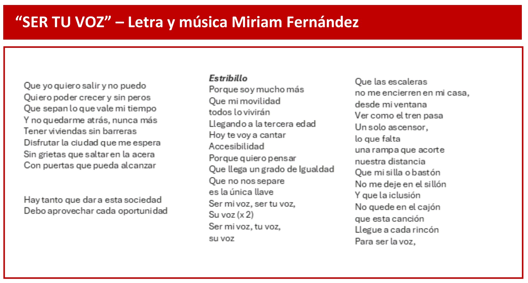 El eje de la campaña es una canción compuesta por la cantautora madrileña Miriam Fernández. El título de la canción es 'Ser tu Voz', disponible ya en Spotify y en los canales digitales de la Fundación, y apela a la accesibilidad universal como derecho de los más de 2,4 millones de españoles con problemas de movilidad para que tengan las mismas oportunidades de vivir en plenitud y participar de manera autónoma en la sociedad.