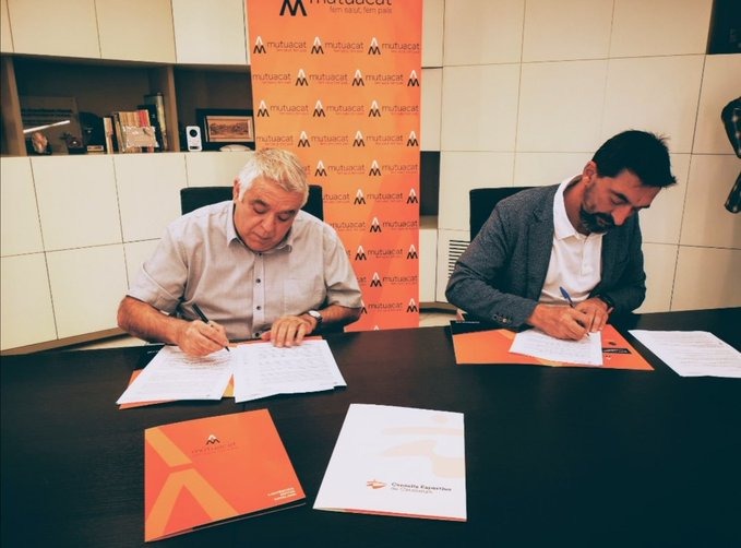 El presidente de los Consells Esportius de Catalunya, Jaume Domingo, y el director general de Mutuacat, Sergi Macià, firmaron un convenio de colaboración por el que Mutuacat ofrecerá seguros deportivos a todos los deportistas de los consejos deportivos hasta 2023.