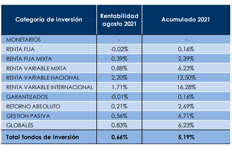 En el conjunto del año, los Fondos de Inversión acumulan una rentabilidad del 5,19%, donde todas las categorías presentan rendimientos positivos, siendo superiores al 10% en aquellas vocaciones centradas en renta variable pura, en el mercado nacional y siendo superiores al 15% en el mercado internacional.