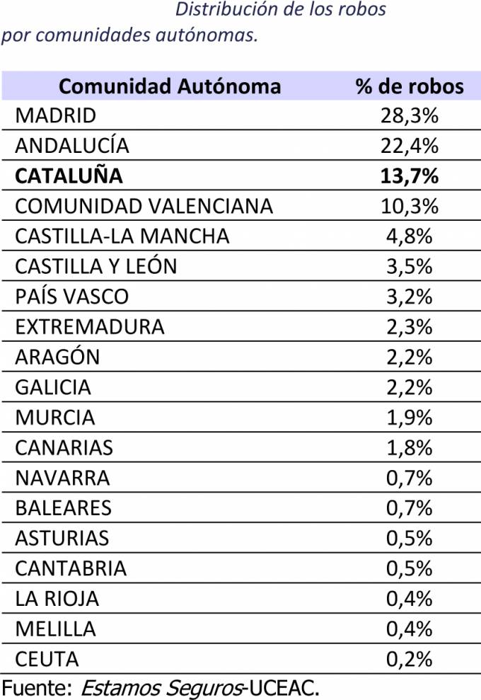Cataluña es el tercer territorio de España donde más robos de coches se producen, el 13,7% del total. Los datos del sector asegurador indican, en ese sentido, que 1 de cada 7 turismos que se roban en España lo son en Cataluña. Sin embargo, Unespa aclara que esta realidad tiene más que ver con la importancia demográfica y económica de Cataluña que con una mayor o menor intensidad de los robos en la comunidad. En términos relativos, sin embargo, la comunidad autónoma se encuentra dentro de la media. Es decir, Cataluña no es ni bastante más peligrosa (como le ocurre a la Comunidad Autónoma de Madrid o Andalucía) ni mucho menos (como pasa con Asturias o Galicia) que el resto del país. Además, la gravedad de los robos ocurridos en suelo catalán es bastante menor que la del conjunto de España. En concreto, el coste medio de cada turismo que se roba ahí es un 21% inferior al del resto del territorio nacional.