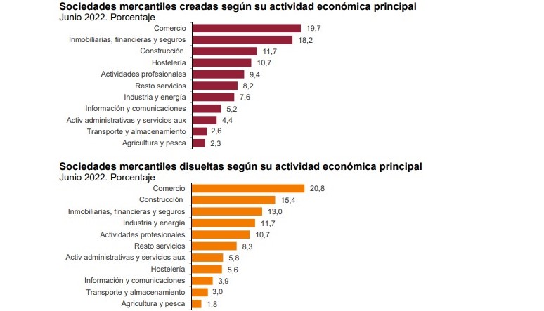 En junio, se crearon en España un total de 8.909 sociedades mercantiles, un 6,8% menos que en el mismo mes de 2021, según datos difundidos por el INE. De este total, el 18,2% pertenecía al grupo de 'Inmobiliarias, financieras y seguros', que solo se vio superado por el Comercio (19,7%).