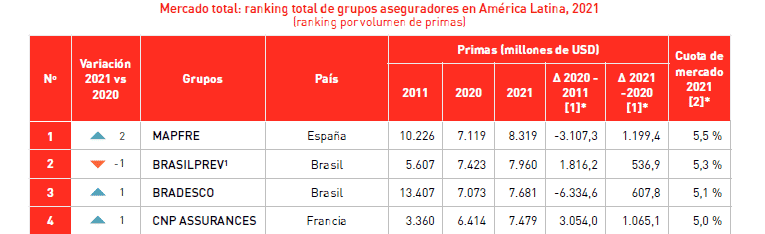 Por primera vez desde el inicio de la serie histórica, Mapfre ha pasado en 2021 a liderar el ranking total de grupos aseguradores de Latinoamérica. Y lo ha conseguido gracias a los 8.319 millones de dólares recaudados en primas en la región, que le ha valido para alcanzar una cuota de mercado del 5,5%.