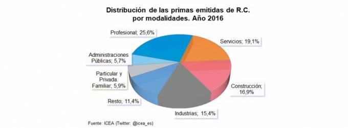 El ramo de RC está compuesto a su vez por varias modalidades de las que que las 3 que agrupan más primas y pólizas son profesional que representa el 25,61% de las primas y el 6,40% de las pólizas, seguido por la de servicios (19,07% de las primas y 13,13% de las pólizas) y la de construcción, con el 16,93% de las primas y el 8,91% de las pólizas, según los últimos datos de ICEA.