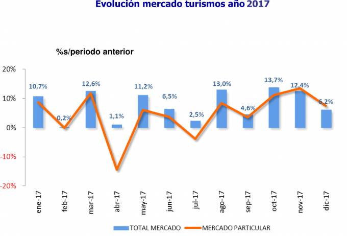 Adolfo Randulfe, director de comunicación de la asociación, destaca que "por 2º mes consecutivo las matriculaciones de turismos en España han vuelto a superar las 100.000 unidades. Algo destacable y que, en el caso de diciembre, no se producía nada menos que desde el ejercicio 2007. Con todo, y siendo el 2017 un año positivo para las matriculaciones de turismos, los 1,23 millones de matriculaciones representarían sólo un 6,4% más que de las logradas en 2008, año que marcó el inicio de la crisis. Si comparamos 2017 con el ejercicio de 2007, que se cerró con 1,6 millones de registros, estaríamos todavía un 23,5% por debajo de las cifras alcanzadas por el mercado antes de la crisis".