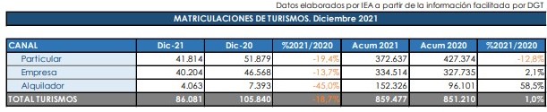 Por canales, el canal de alquiladores ha registrado la peor caída en diciembre, al experimentar un descenso del 45%, hasta las 4.063 unidades. En el conjunto del año, sin embargo, este canal ha incrementado sus compras un 58,5% respecto de 2020, hasta las 152.326 unidades.