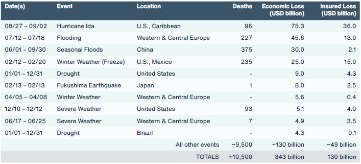 La catástrofe que ocasionó mayores pérdidas económicas en 2021 fue el Huracán Ida, que azotó Estados Unidos y el Caribe entre el 26 de agosto y el 4 de septiembre. Los costes totales superaron los 75.000 millones de dólares, de los que 36.000 millones estaban asegurados. Además, provocó casi un centenar de muertes.