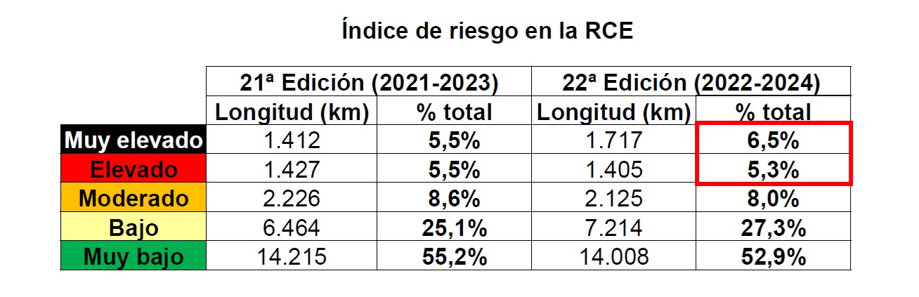 3.122 km de carreteras españolas, lo que supone en 11,8% de la red, presentan un riesgo elevado o muy elevado de accidente, según se desprende de la 22ª edición estudio iRAP que dibuja el mapa de riesgo de la red de carreteras del Estado durante el trienio 2022-2024. La peligrosidad ha aumentado en las vías de titularidad ministerial un 0,8% respecto a la edición anterior, aunque el número de tramos con riesgo muy elevado ha pasado de 82 a 95, lo que representa un incremento del 15,9% en los puntos críticos de la red.