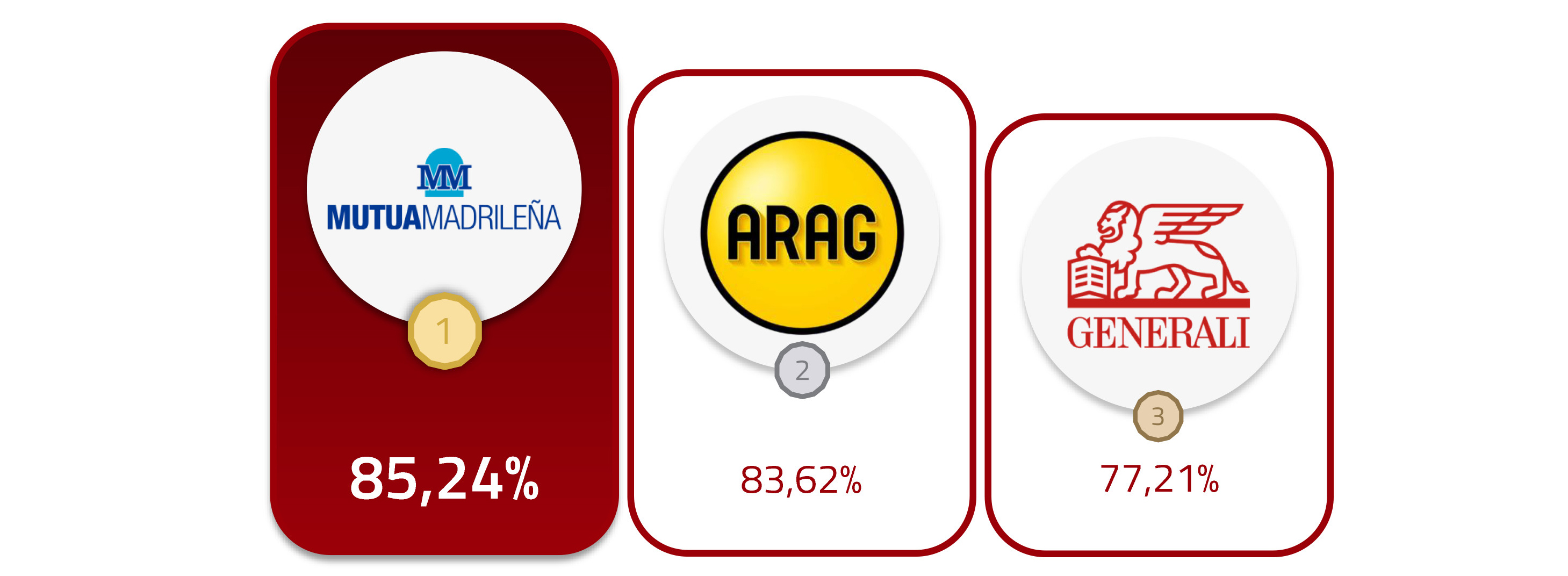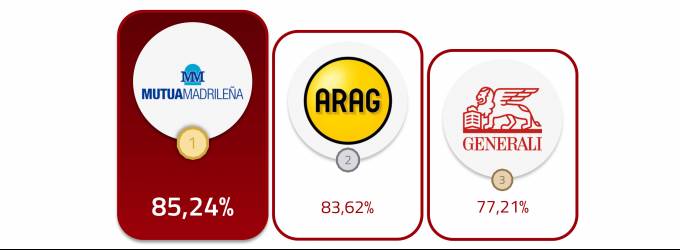 Así, de nuevo Mutua Madrileña lidera la clasificación general del ranking, con una puntuación total de 85,24 puntos. A continuación, le siguen ARAG (83,62 puntos) y Generali (77,21).