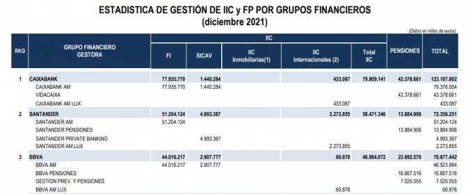 Caixabank, con 123.187 millones de euros; Santander con 72.356 millones de euros y BBVA con 70.677 millones de euros son las tres entidades financieras que lideran el ranking de Inverco de IIC y FP de 2021.