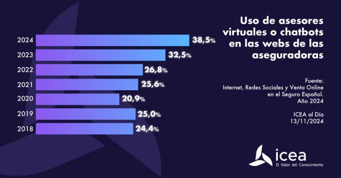 El uso de asesores virtuales o chatbots ha aumentado en los dos últimos años y alcanza el 38,5% de aseguradoras que los utilizan. Según ICEA, su uso ha crecido de forma notable en los dos últimos, pasando primero del 32,5% al actual 38,5%. Además, un 23,1% de entidades tienen prevista su instalación. Sobre la funcionalidad de estos asesores virtuales o chatbots, un 34,8% de los mismos utilizan inteligencia artificial y otro 39,1% lo tienen previsto.
