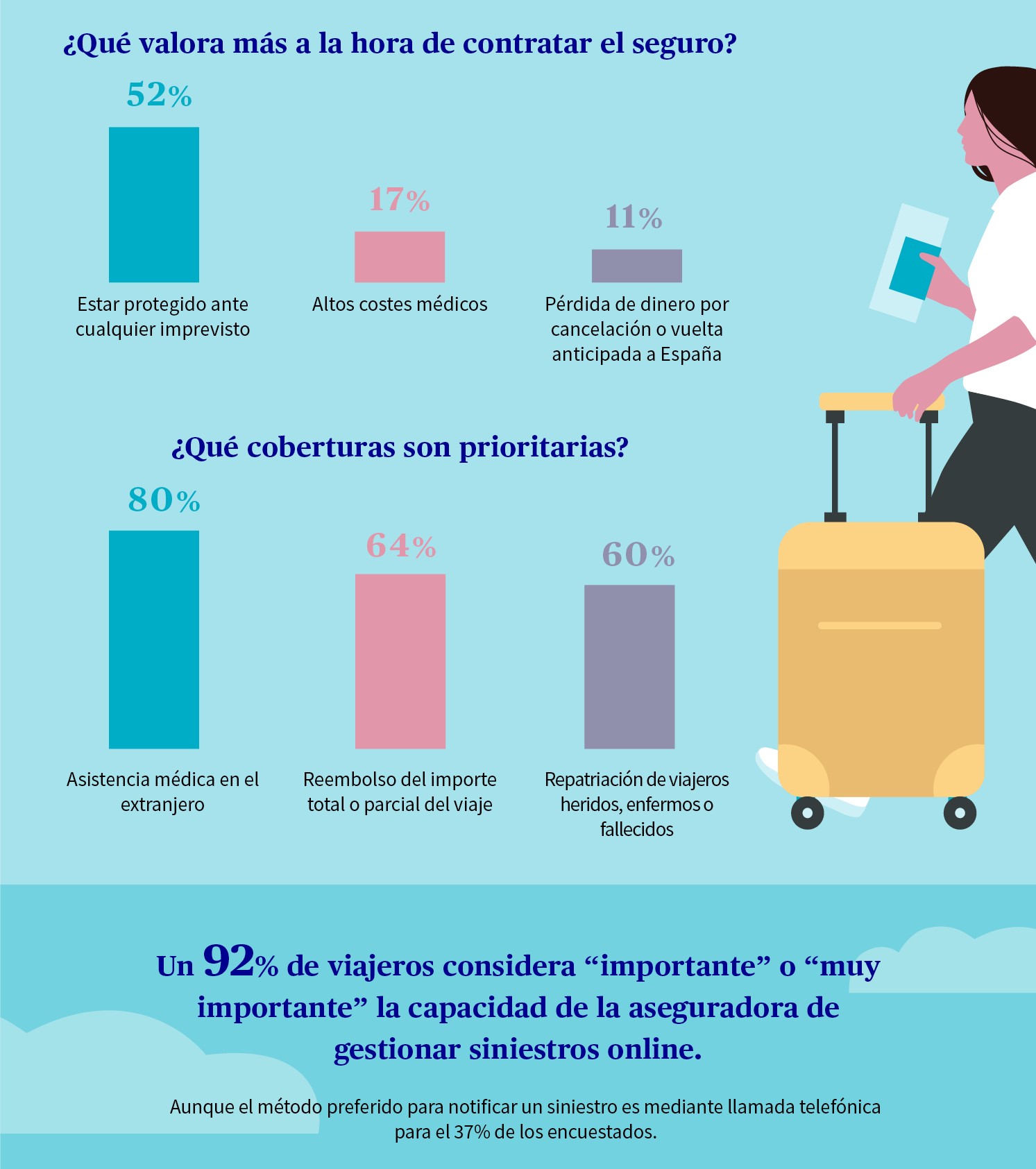 Entre los motivos para contratar un seguro de viaje, el 52% señala la protección ante cualquier imprevisto durante el viaje, por delante de los elevados costes médicos en el país de destino (17%) y la prevención ante la pérdida de dinero por la cancelación del viaje o un regreso anticipado a España (11%). Respecto a las prestaciones más valoradas en un seguro de viaje, un 80% destaca la asistencia médica en el extranjero, que engloba atención y cobertura de gastos sanitarios; un 64%, el reembolso total o parcial del importe del viaje; y un 60%, la cobertura de los costes de repatriación.