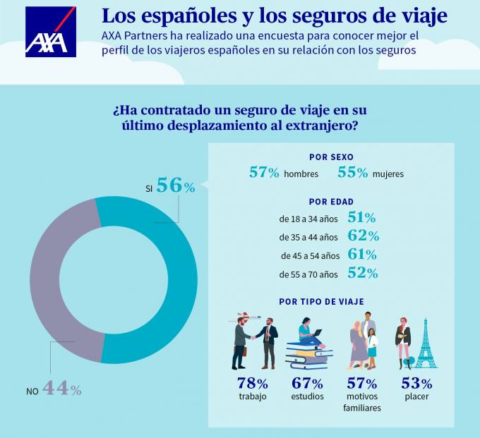 También se extrae de este informe que el porcentaje de contratación es significativamente más elevado en los viajes por motivos de trabajo (78%) o estudios (67%), frente a los viajes por motivos familiares (57%) o por placer (53%). El 75% de los encuestados que viajaron con un seguro aseguran que lo volverán a contratar.