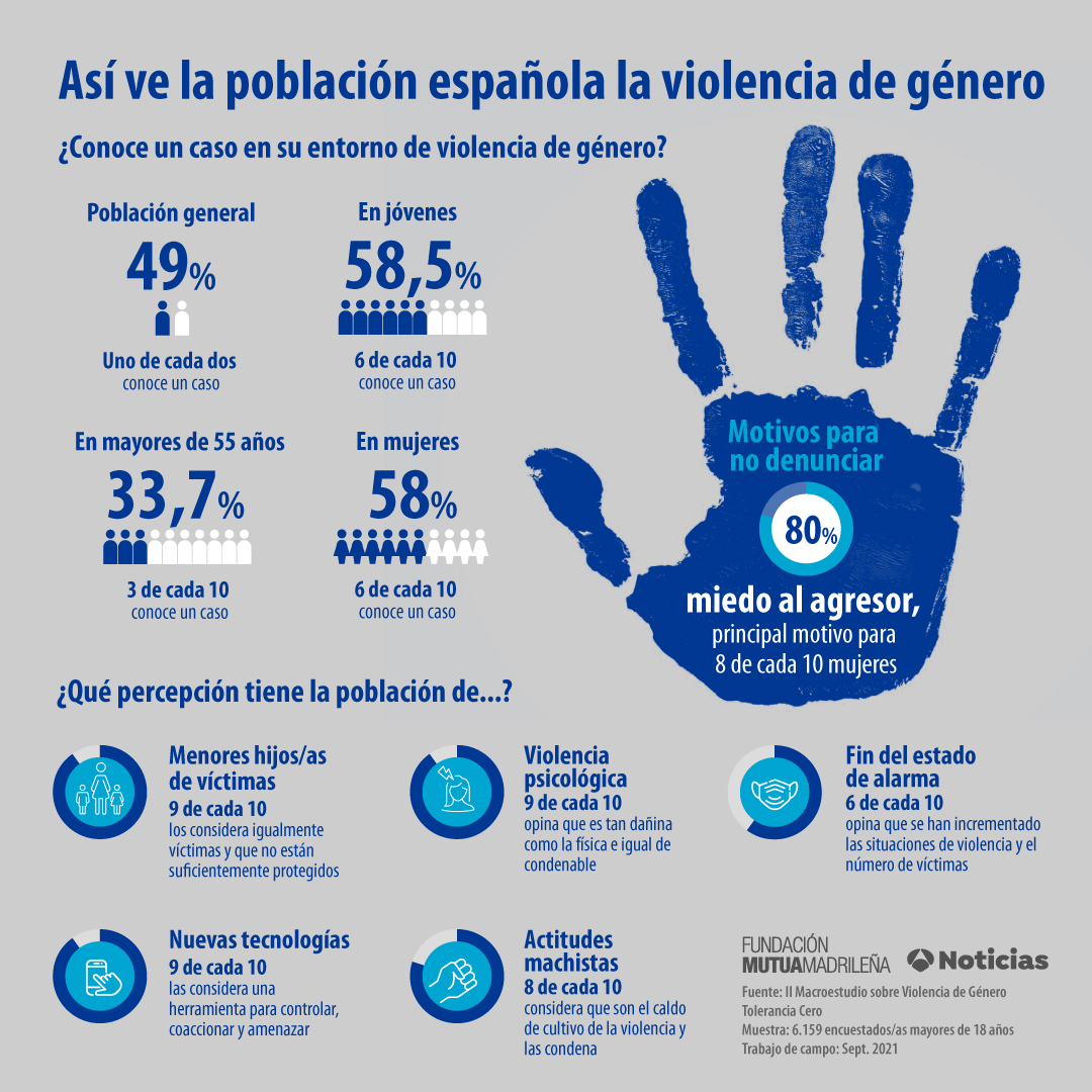 El 49% de la población conoce un caso cercano de violencia de género, son 4 p.p. más que en 2020. Además, sube hasta el 60% entre los jóvenes los que declaran conocer algún caso cercano. Estas son algunas de las conclusiones del II Macroestudio de Violencia de Género "Tolerancia Cero" elaborado por Mutua Madrileña y Antena 3 Noticias dentro de su iniciativa de responsabilidad corporativa "Contra el maltrato, Tolerancia Cero".