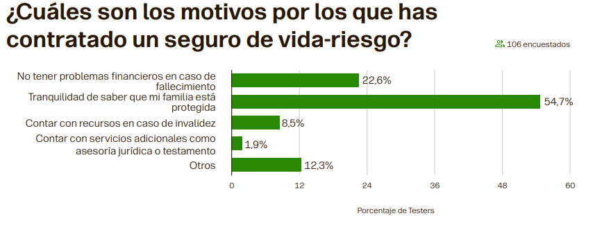 En cuanto a los motivos para la contratación, los consumidores mencionan la tranquilidad de la familia esté protegida; el segundo es tener resueltos posibles problemas financieros en caso de fallecimiento; el tercero, contar con recursos en caso de invalidez.