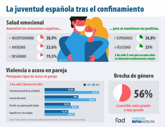 El 56% de los jóvenes consideran que la brecha de género sigue existiendo en la población general pero, en menor medida, entre la juventud. Además, preocupa el agravamiento de las experiencias de acoso en pareja, que afectan a más de 3 de cada 5 jóvenes, según datos del estudio 'Género, Vivencias y Percepciones sobre la Salud', realizado por la Fundación Mutua Madrileña y Fad, a través del Centro Reina Sofía sobre Adolescencia y Juventud.