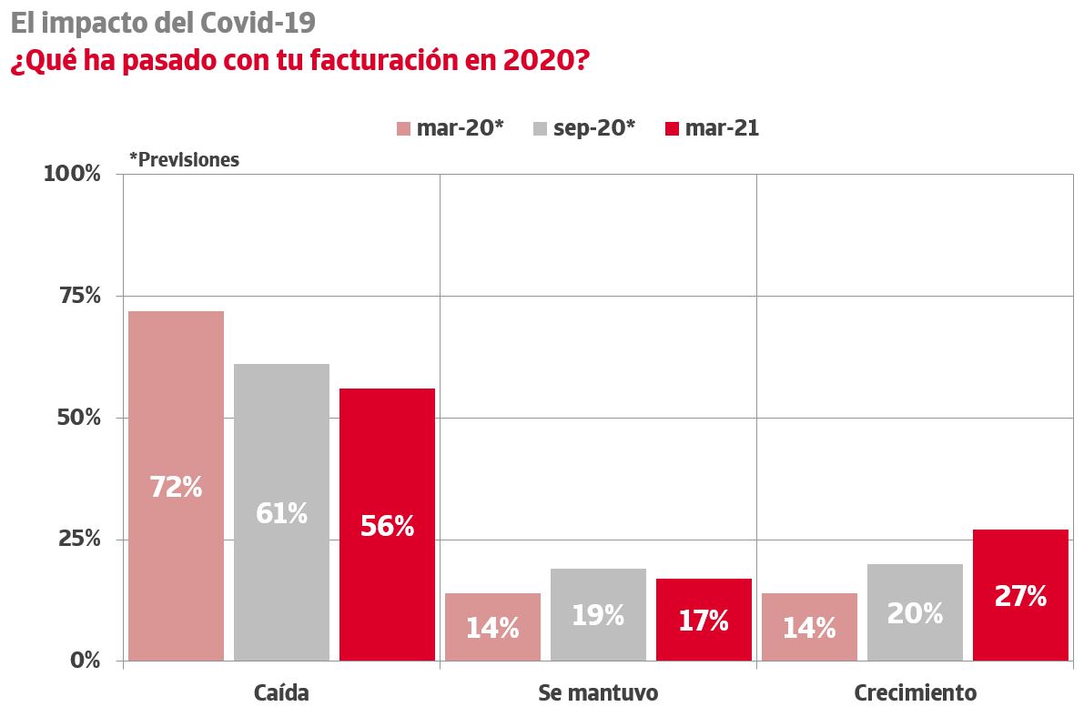 Otra conclusión que se extrae de este estudio es que el 56% del tejido productivo ha registrado una disminución de sus ventas en 2020, moderándose las previsiones que apuntaban a un 72%. Si bien, las empresas se muestran esperanzadoras de cara al ejercicio 2021: un 53% espera que sus niveles de facturación vuelvan a remontar, frente a un exiguo 14% que espera que este ejercicio sea peor que el anterior en términos de ingresos.