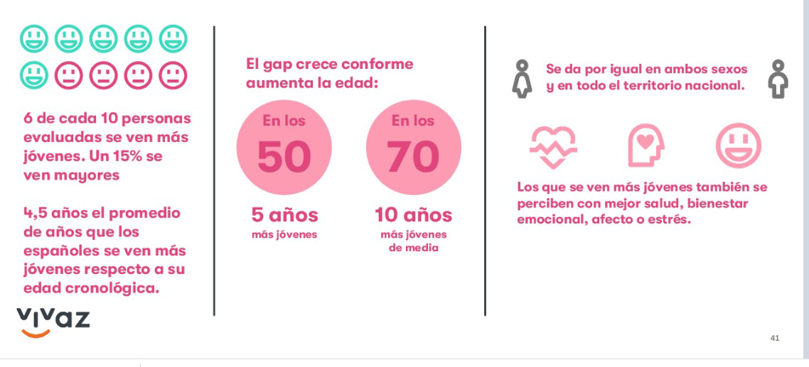 El 60% de los españoles se ve entre 4 y 5 años más jóvenes de lo que realmente son. Así lo señala el estudio 'Edad cronológica vs. edad real ¿qué edad creen que tienen los españoles?' que acaba de dar a conocer Vivaz y que ha sido realizado en colaboración con el doctor Manuel Castillo, catedrático de la Facultad de Medicina de Granada, presidente Científico de la Sociedad Española de Medicina Antienvejecimiento y Longevidad, y asesor médico de Vivaz Seguros de Salud.