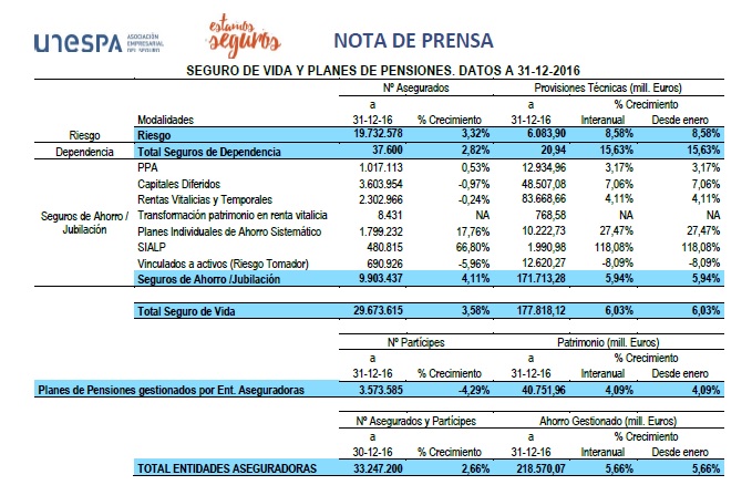 Las rentas vitalicias aseguradas se consolidan como sistema de previsión complementario. A cierre de 2016, 8.431 personas mayores de 65 años transformaron el dinero logrado con la venta de algún elemento patrimonial (una 2ª vivienda, fondos de inversión, acciones, etc.) en una fuente garantizada de ingresos de por vida. Estas personas se acogieron a las ventajas fiscales que se establecieron para este producto a raíz de la última reforma del IRPF, según explica Unespa. Estas rentas vitalicias acumulan un volumen de ahorro bajo gestión de 769 millones de euros. Las entidades empezaron a comercializar estos productos hace poco más de un año; 2016 ha sido el primer ejercicio completo en que se han computado este tipo de operaciones de seguro.