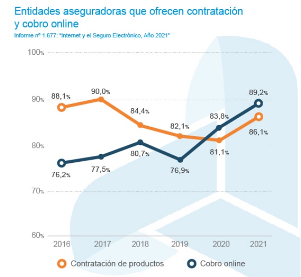 El 86,1% de las aseguradoras ya permiten la contratación online de sus productos. Esto supone un crecimiento de 5 p.p. respecto a 2020. Además, son casi un 90% las que permiten el cobro online, según datos de ICEA.