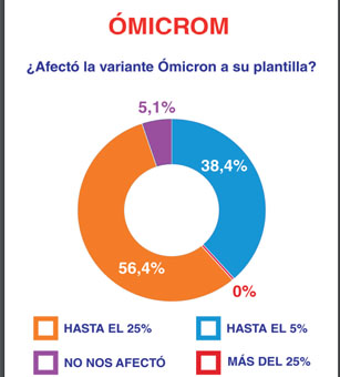 Además, no solo es que 9 de cada 10 grupos tuvieran a Ómicron muy presente, si no que la incidencia salpicó tanto a sus compañías que más de la mitad (56,4%) revela que afectó al 25% de su plantilla. Mientras que otro 38,4% señala que la afectación fue de hasta el 5% de sus trabajadores.