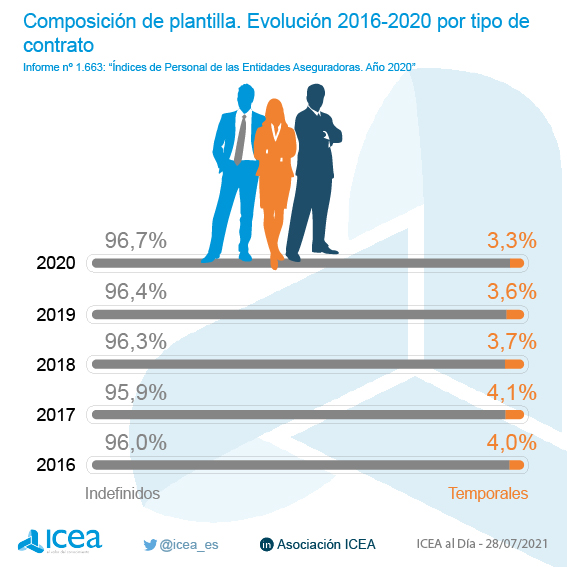 Los datos de ICEA sitúan en un 96,7% la tasa de empleo indefinido en el sector asegurador al cierre de 2020, casi 0,4 puntos más que el año anterior. "La tasa de temporalidad es una de las más bajas entre los diferentes sectores económicos en España, ya que la media de todos ellos fue del 24,1% de contratos temporales en 2020, 7,4 veces mayor que en seguros", añade ICEA.